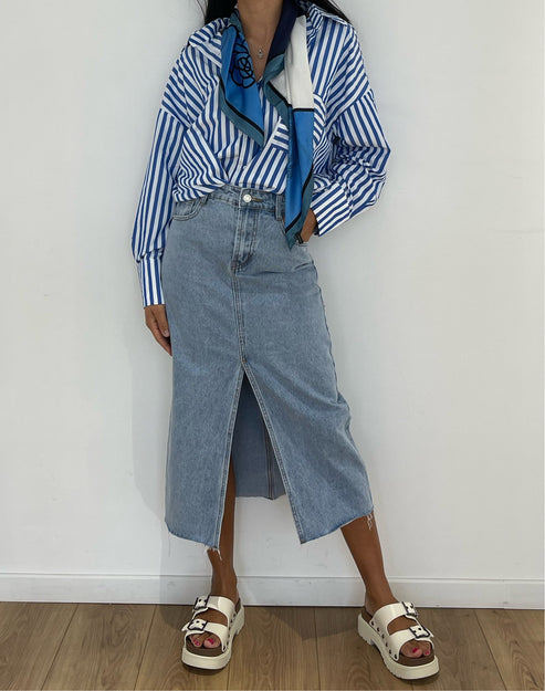La jupe en jean est intemporelle. Elle transcende les âges et s’impose comme une pièce essentielle de la garde-robe féminine. Associée à la longueur midi, qui allonge et affine la silhouette, elle devient encore plus élégante.