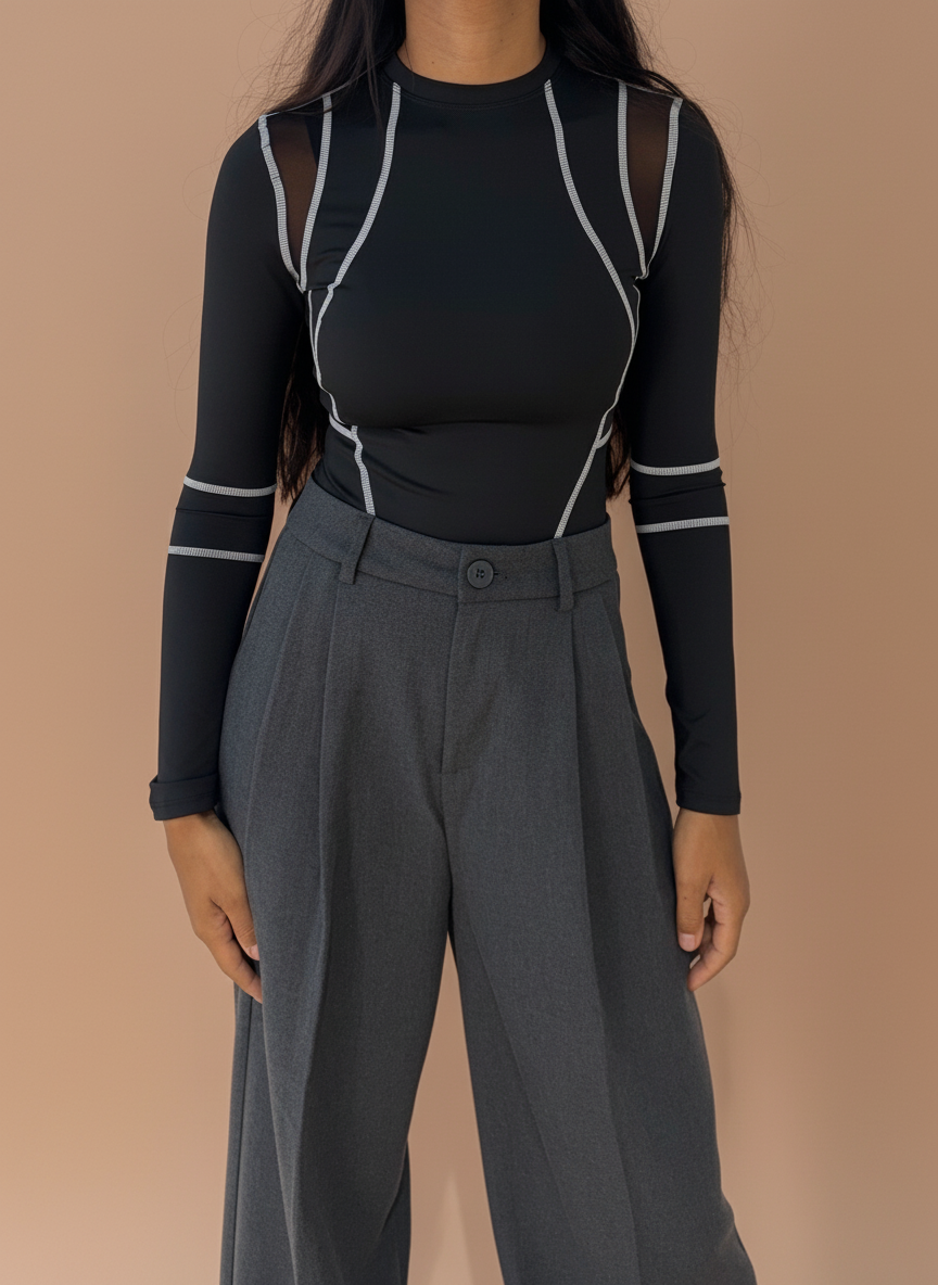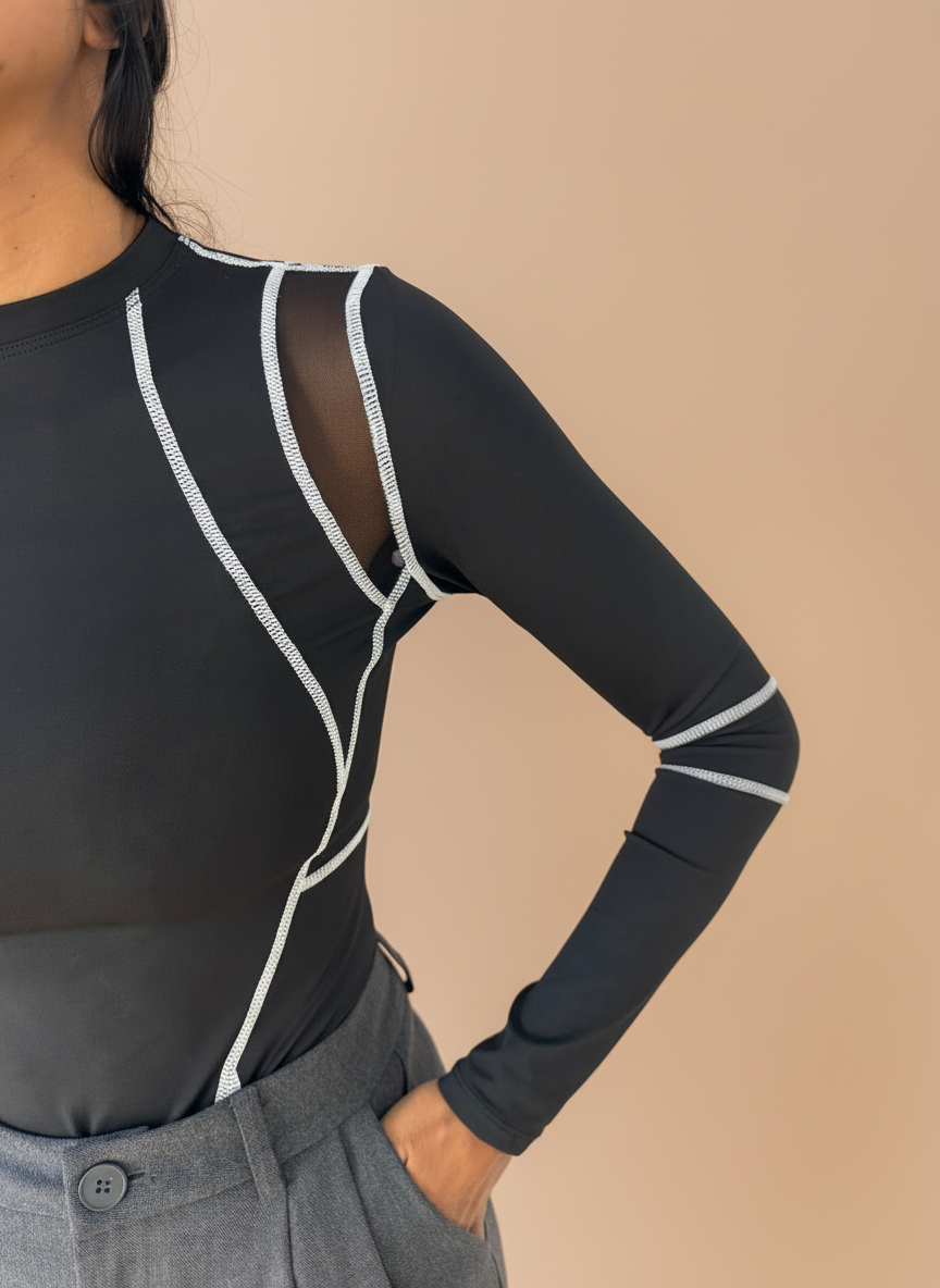 Body noir à manches longues au design moderne et structuré, sublimé par des surpiqûres contrastées qui redessinent la silhouette. Sa coupe ajustée épouse parfaitement les formes tout en offrant un maintien confortable et flatteur. Conçu dans une matière douce et extensible, il apporte une touche contemporaine et féminine à vos tenues du quotidien. Le détail transparent sur les épaules et les lignes contrastées apportent un effet graphique et tendance, idéal pour un look affirmé. À porter seul avec un pantalon taille haute ou en superposition sous un blazer pour un style plus sophistiqué. Ce body s’impose comme une pièce forte et versatile, parfaite pour créer des silhouettes élégantes et audacieuses.