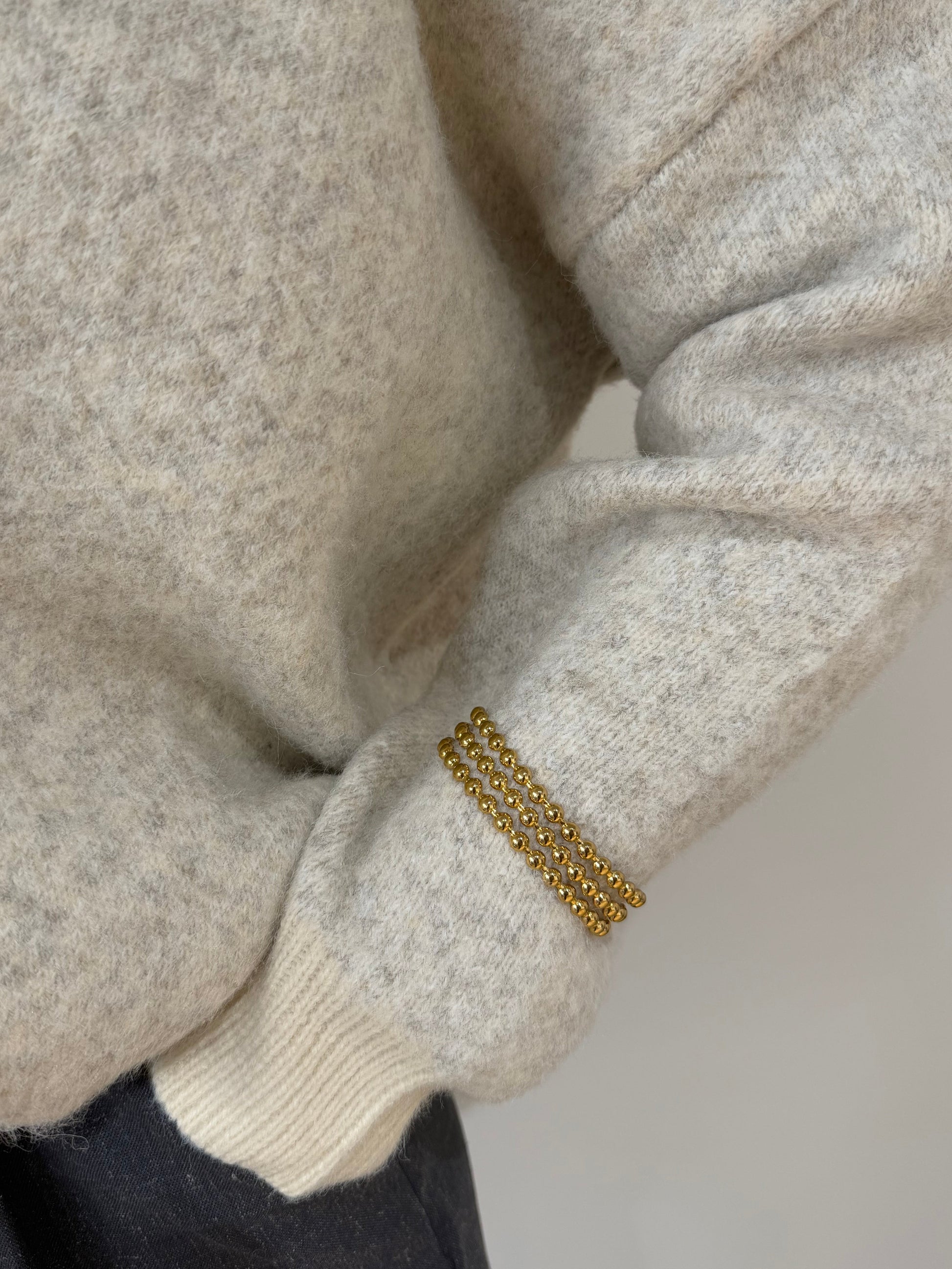 Ce bracelet manchette doré se démarque par son jeu de perles en relief, disposées en rangs réguliers pour un rendu à la fois moderne et sophistiqué. Son effet texturé et brillant capte la lumière et apporte immédiatement du caractère à la tenue. La forme manchette ouverte permet un ajustement confortable au poignet tout en assurant un bon maintien. Élégant sans être excessif, il se porte aussi bien seul comme pièce forte qu’en accumulation avec d’autres bracelets plus fins. Un bijou intemporel, idéal pour sublimer une tenue de jour comme de soirée.