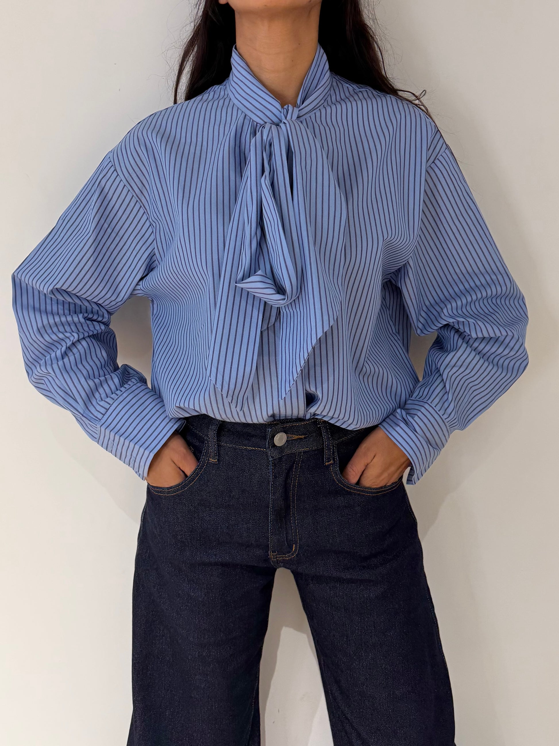 Chemise rayée bleu et blanche à col lavallière, idéale pour apporter une touche élégante et moderne au quotidien. Son nœud intégré à nouer selon l’envie offre plusieurs styles : version chic en nœud serré, plus décontractée en laissant les pans tomber librement. Coupe ample, manches longues à poignets boutonnés, lignes verticales affinent la silhouette tout en gardant un tombé fluide.