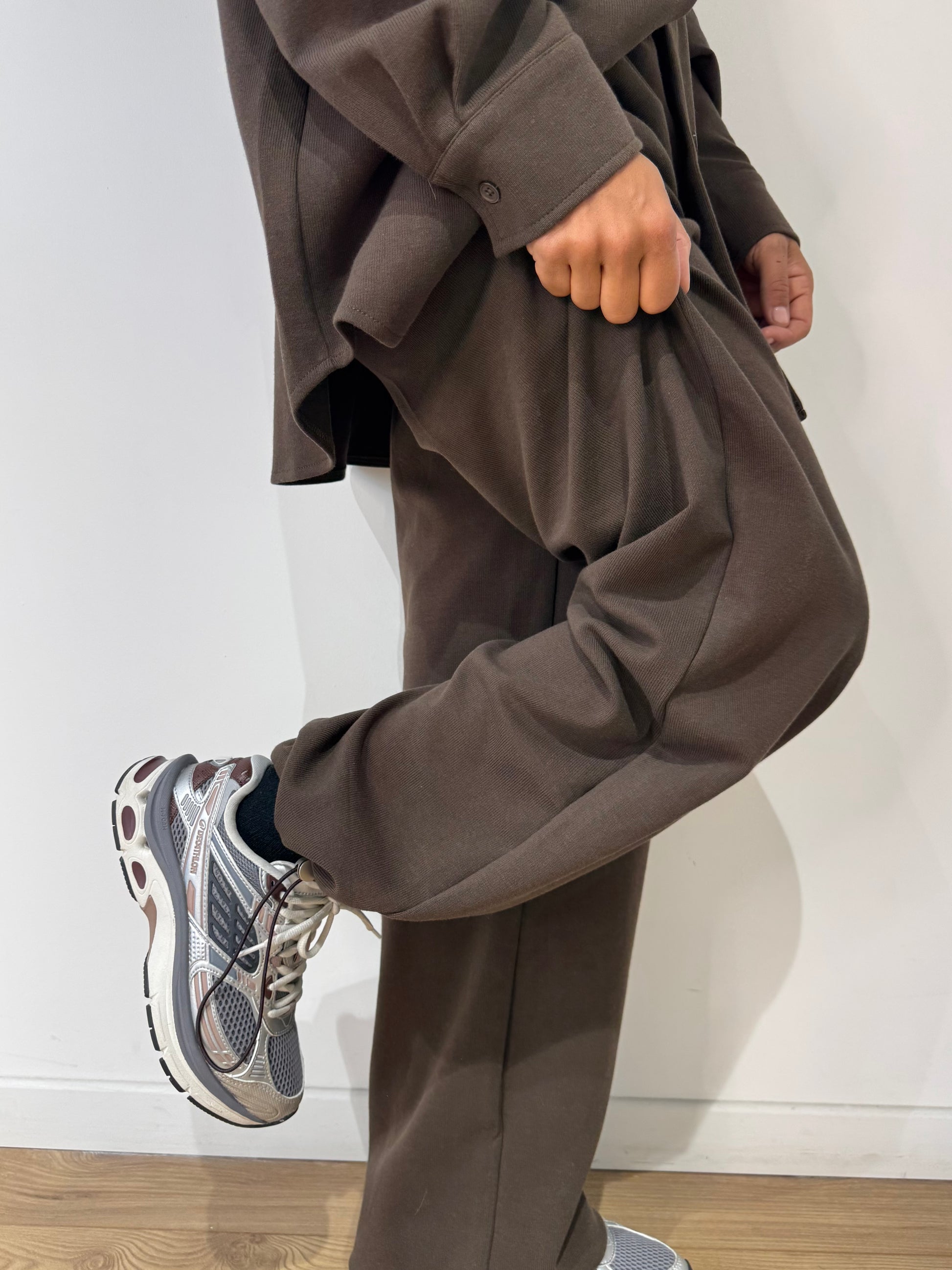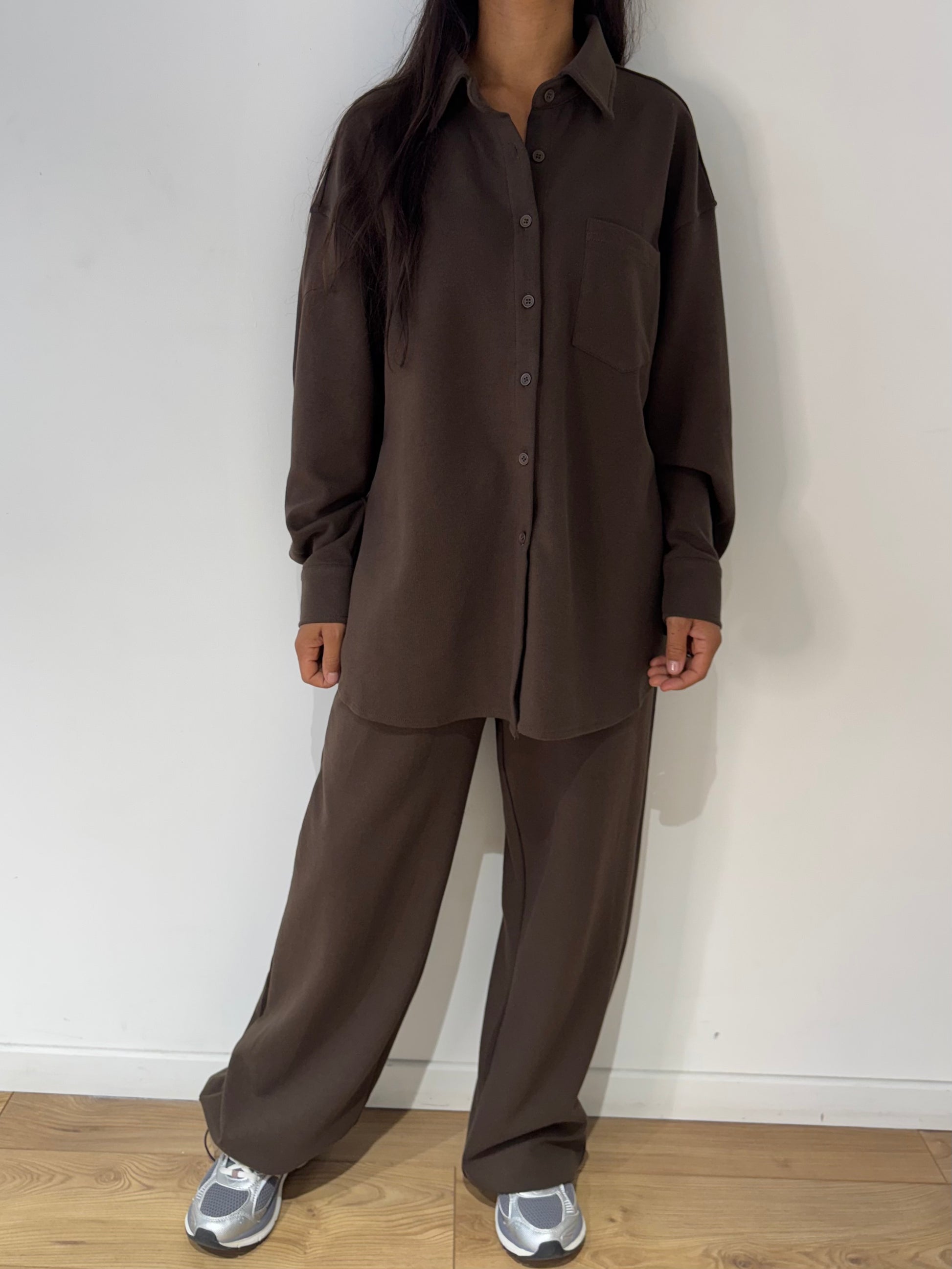 Portez-le avec des baskets pour un look décontracté et moderne. Rentrez légèrement la chemise dans le pantalon pour structurer la silhouette, ou laissez-la ouverte sur un débardeur pour un style plus cool et détendu. En automne, ajoutez un trench long ou une veste en cuir pour un effet plus travaillé. Cet ensemble s’adapte à toutes les occasions : parfait pour voyager, travailler ou profiter d’un week-end confort sans compromettre l’élégance.