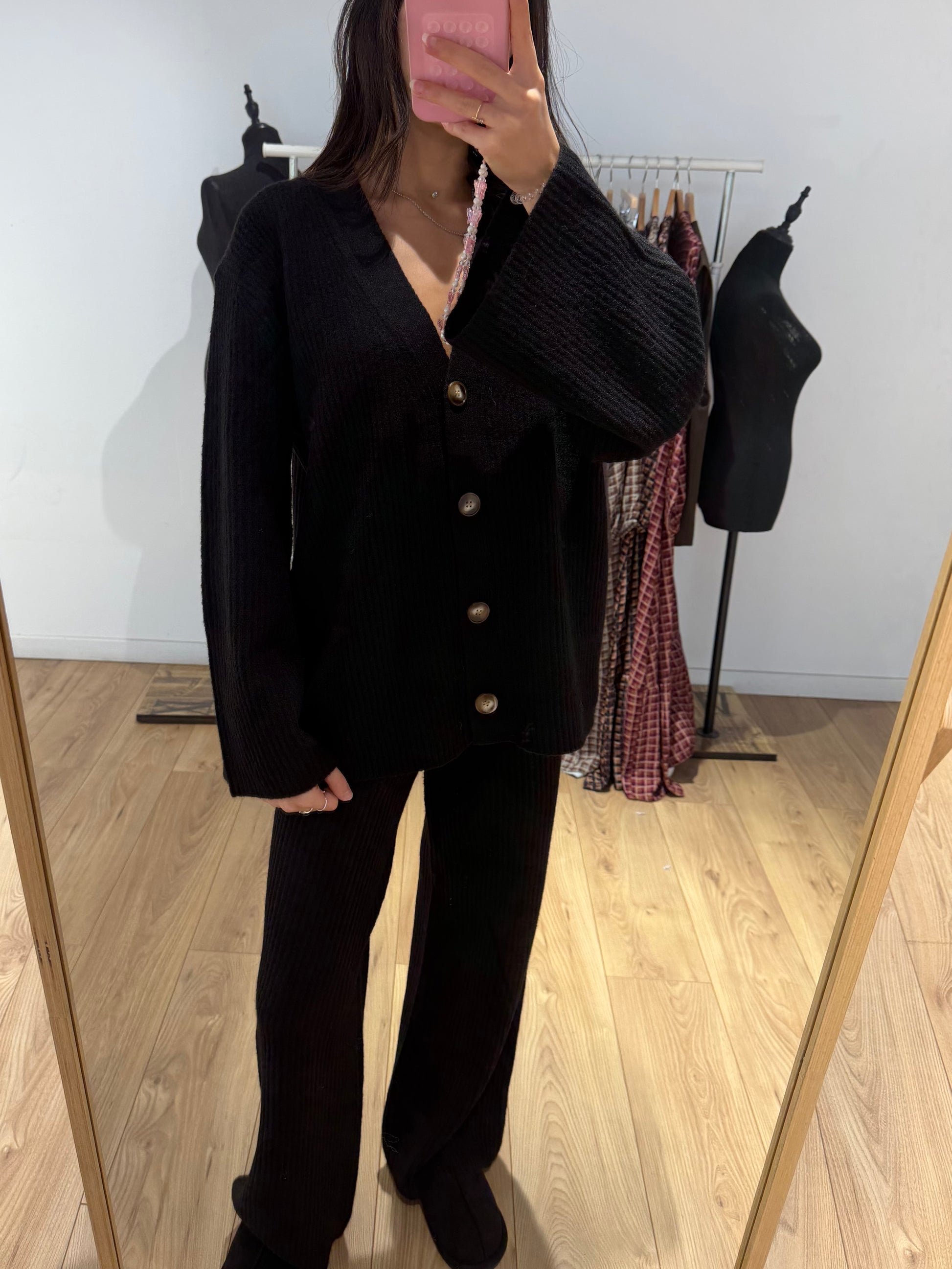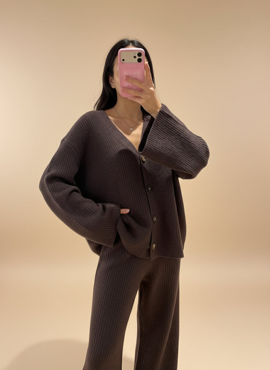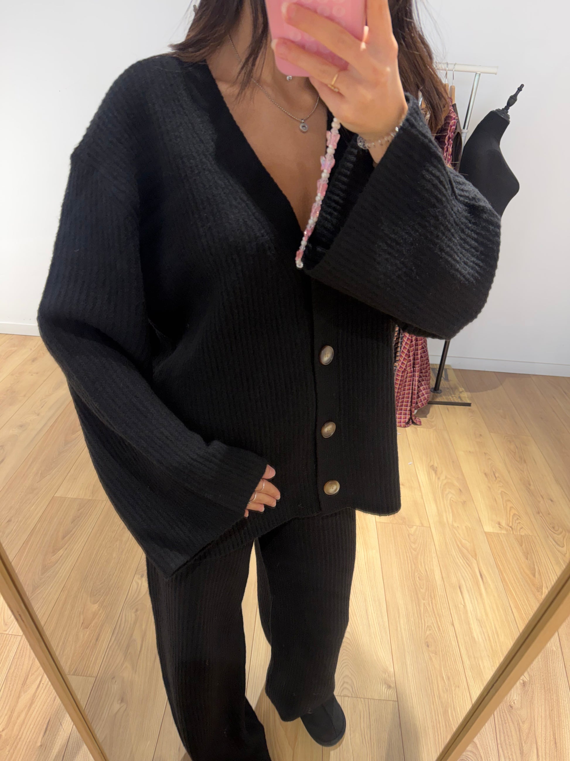 Découvrez notre ensemble côtelé femme composé d’un gilet boutonné à manches larges et d’un pantalon coupe large, parfait pour un look moderne et confortable. Le gilet présente une coupe ample, un joli décolleté en V et de beaux boutons effet écaille qui apportent une touche chic. Le pantalon, taille haute et fluide, allonge la silhouette tout en offrant une liberté totale de mouvement. Idéal pour créer un style élégant sans effort, cet ensemble est parfait aussi bien en tenue d’intérieur cocooning qu’en look city casual avec des baskets ou des bottines. Disponible en beige doux, marron chocolat et noir intemporel, il s’adapte facilement à toutes les morphologies grâce à sa coupe confortable. Cet ensemble devient rapidement un essentiel du dressing pour un style minimaliste, raffiné et tendance au quotidien.
