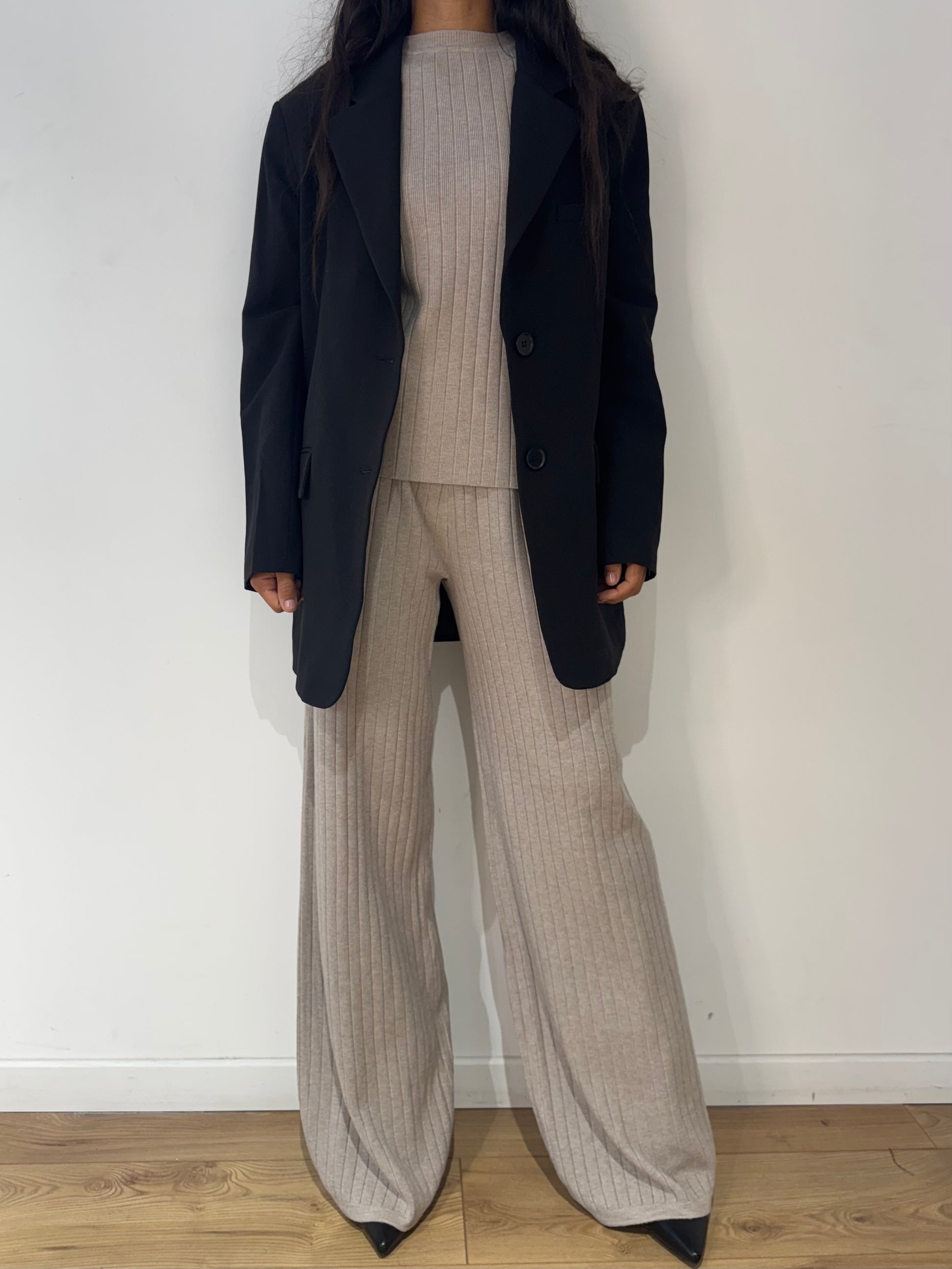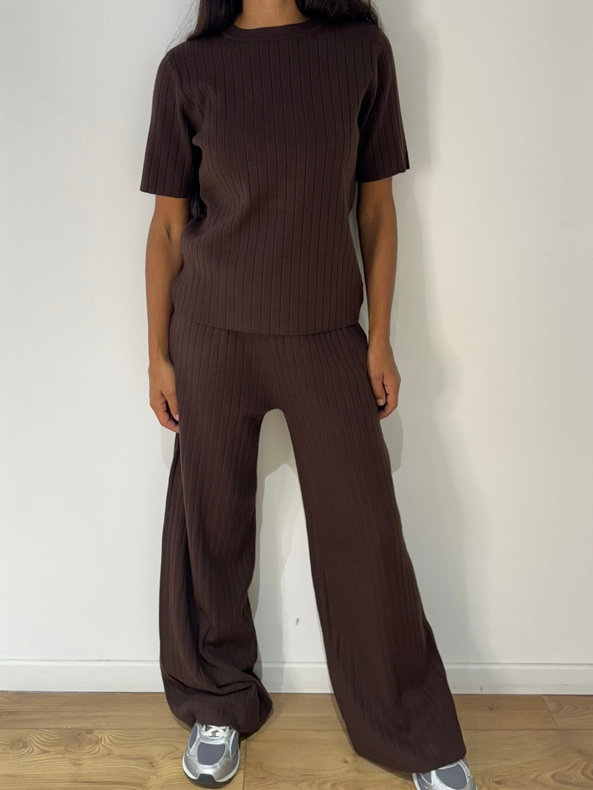 Ensemble côtelé à la fois confortable et élégant, composé d’un top à manches courtes et d’un pantalon large taille haute. Sa maille douce et extensible épouse les formes sans les marquer, offrant un tombé fluide et une sensation de légèreté au quotidien. Cet ensemble minimaliste s’impose comme une tenue parfaite pour un style chic et décontracté, que ce soit à la maison, au bureau ou en sortie. Le top à encolure ronde se combine harmonieusement avec le pantalon à coupe ample pour une silhouette équilibrée et moderne. Disponible en beige, noir et marron, trois teintes neutres et intemporelles qui s’adaptent à toutes les saisons et à tous les styles. Une pièce essentielle du vestiaire féminin, à la fois cosy, moderne et raffinée.