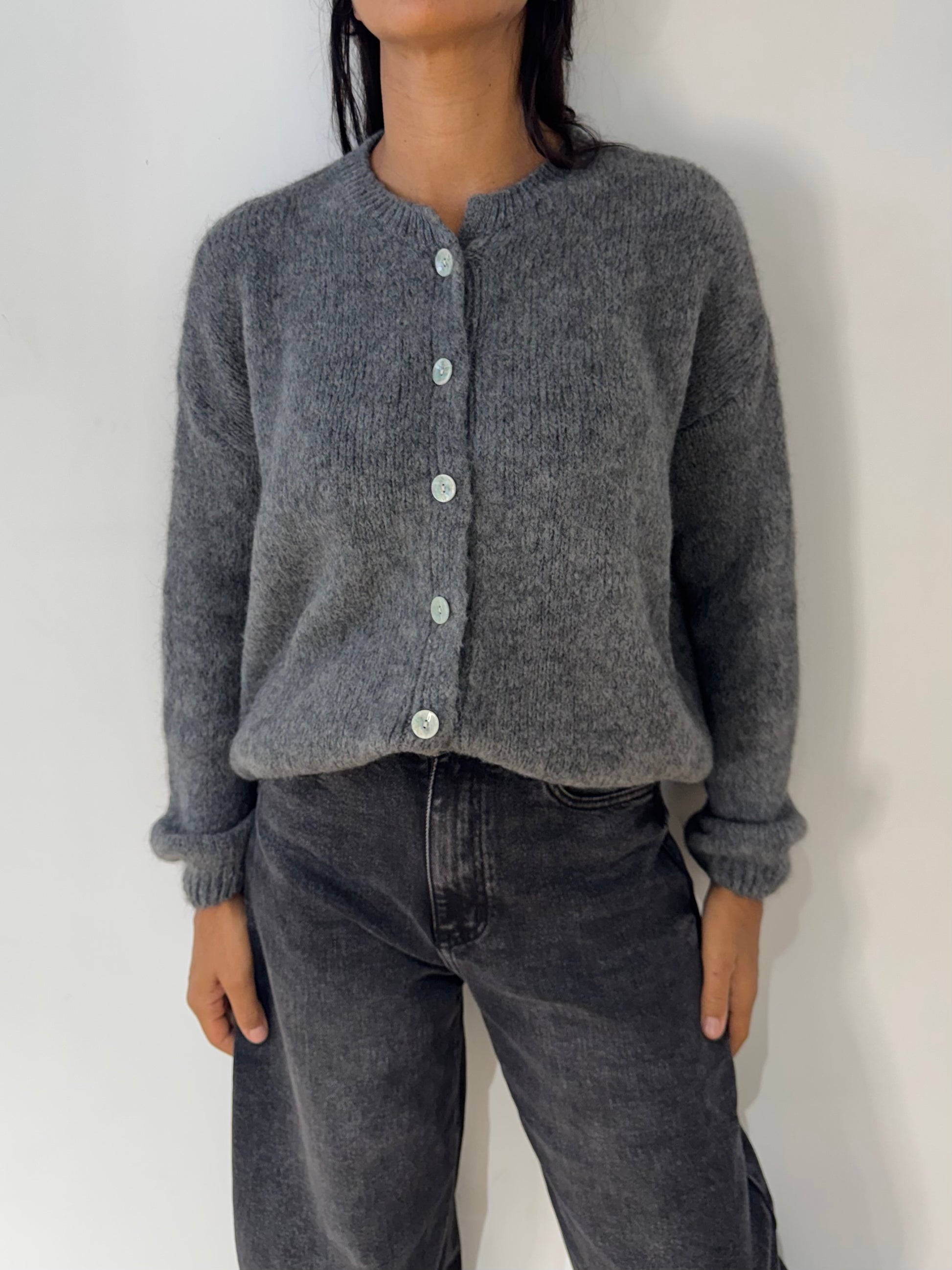 Cardigan en kid mohair à la texture douce et légère, parfait pour apporter chaleur et élégance à vos tenues du quotidien. Sa coupe droite et légèrement ample offre un tombé naturel et une allure décontractée tout en restant raffinée. Fermé par une rangée de boutons nacrés, il peut se porter aussi bien boutonné qu’ouvert sur un top ou une chemise. Idéal pour la mi-saison comme pour les journées plus fraîches, il s’adapte à tous les styles, du look casual avec un jean au style plus chic sur un pantalon fluide ou une jupe midi. Disponible en bordeaux, noir, marine, gris et rouge, ce cardigan allie confort, féminité et intemporalité pour devenir un incontournable du dressing.