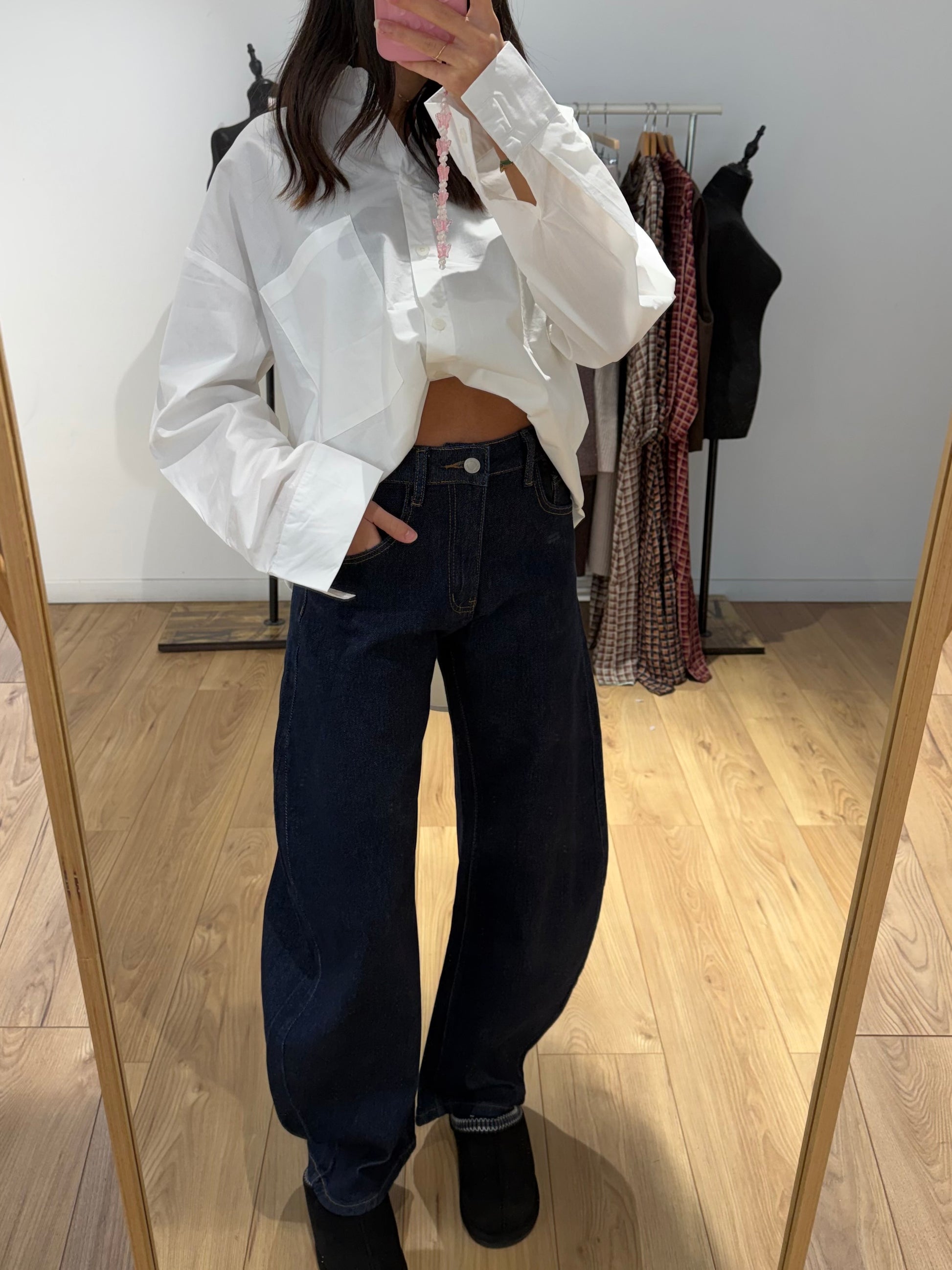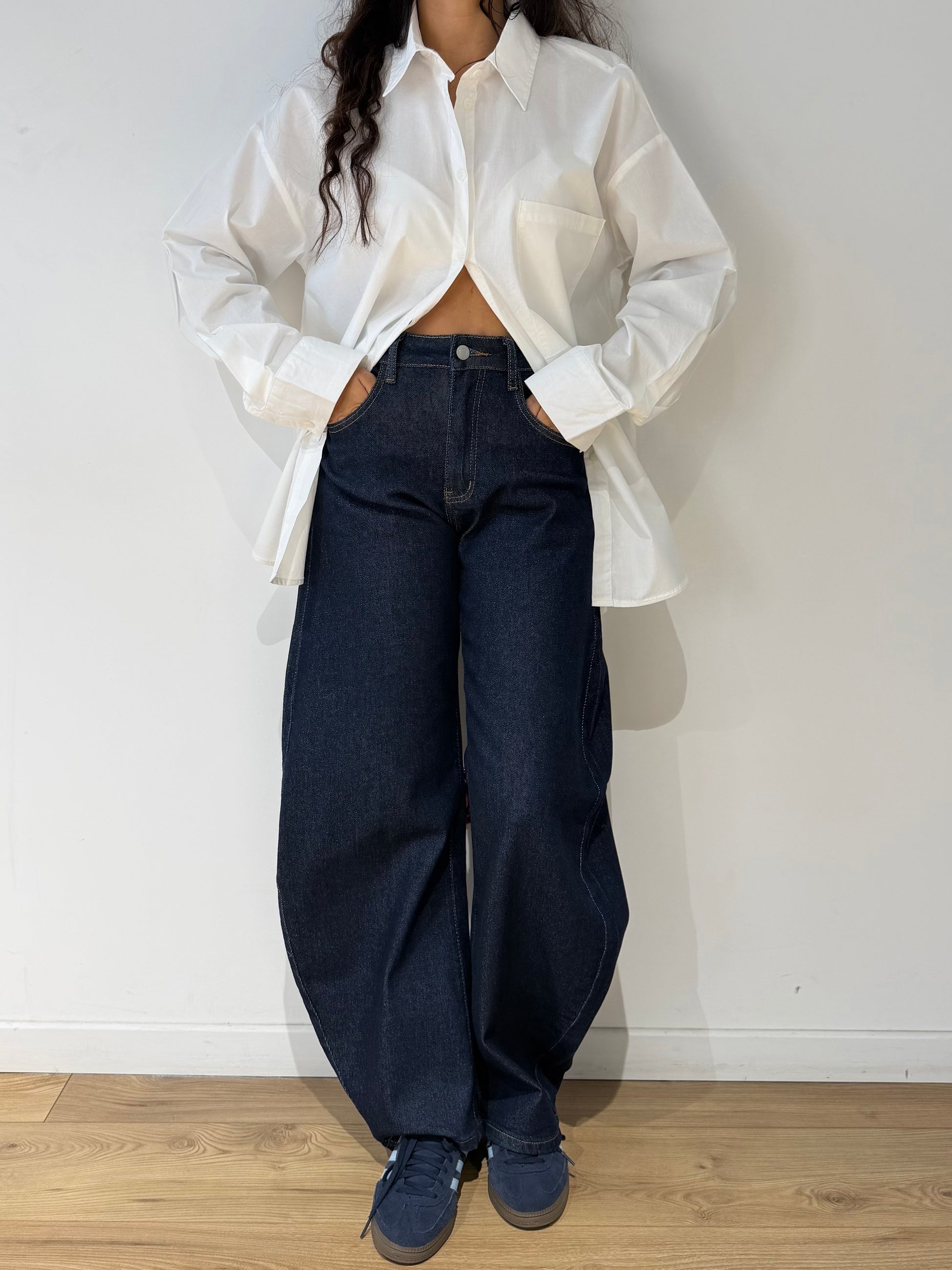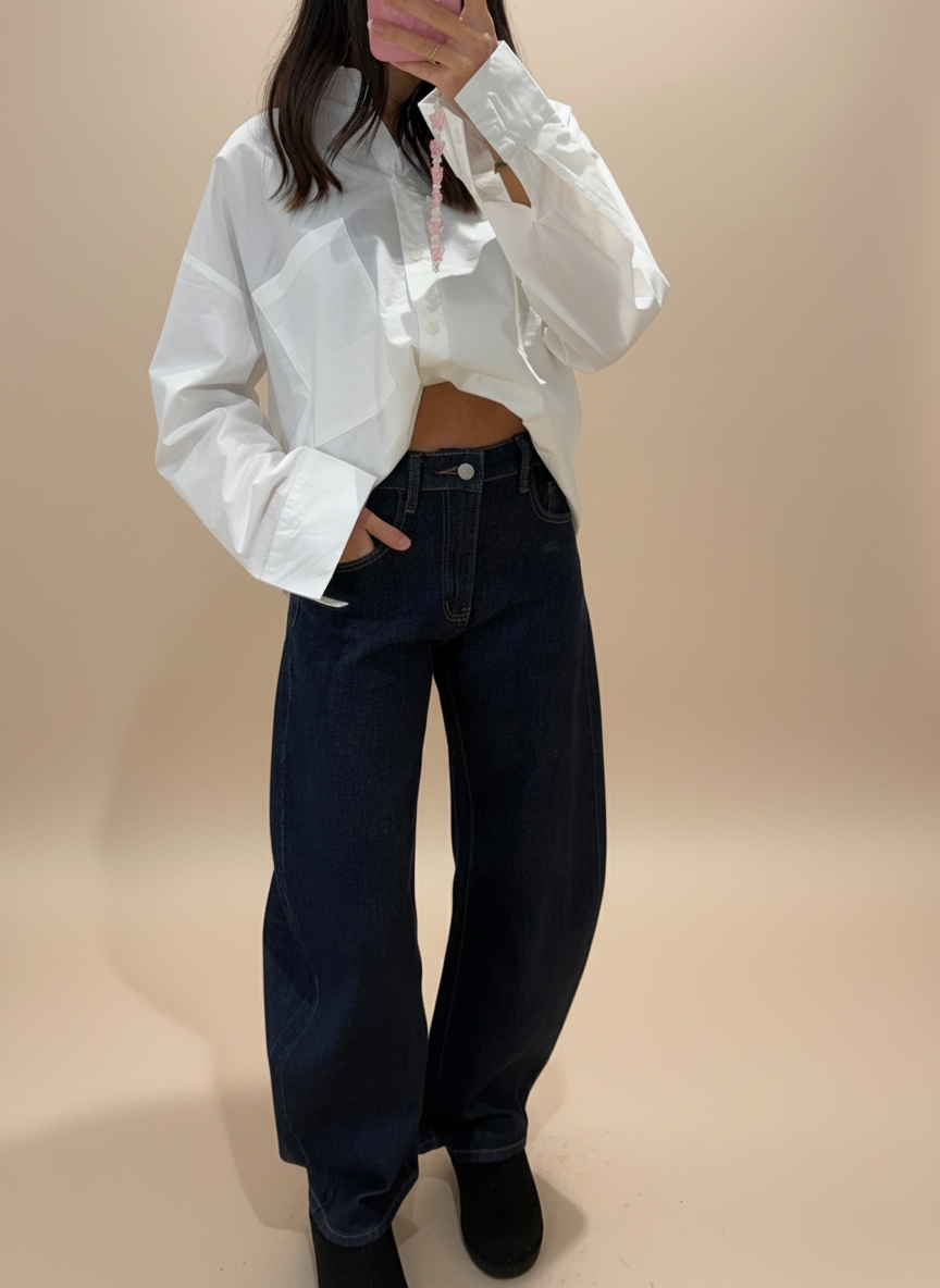 Jean barrel taille haute en coton, il se caractérise par sa coupe arrondie au niveau de la jambe : ample sur les hanches, plus ajusté à la cheville. Sa toile en denim brut apporte de la structure tout en gardant un bon maintien. Confortable et stylé, ce jean en coton accompagne facilement le quotidien. Il se porte avec une chemise oversize, un t-shirt simple ou un pull court pour équilibrer les volumes. Associé à des baskets pour un look décontracté ou à des bottines pour une allure plus travaillée, c’est une pièce forte et moderne qui apporte du caractère à la silhouette.