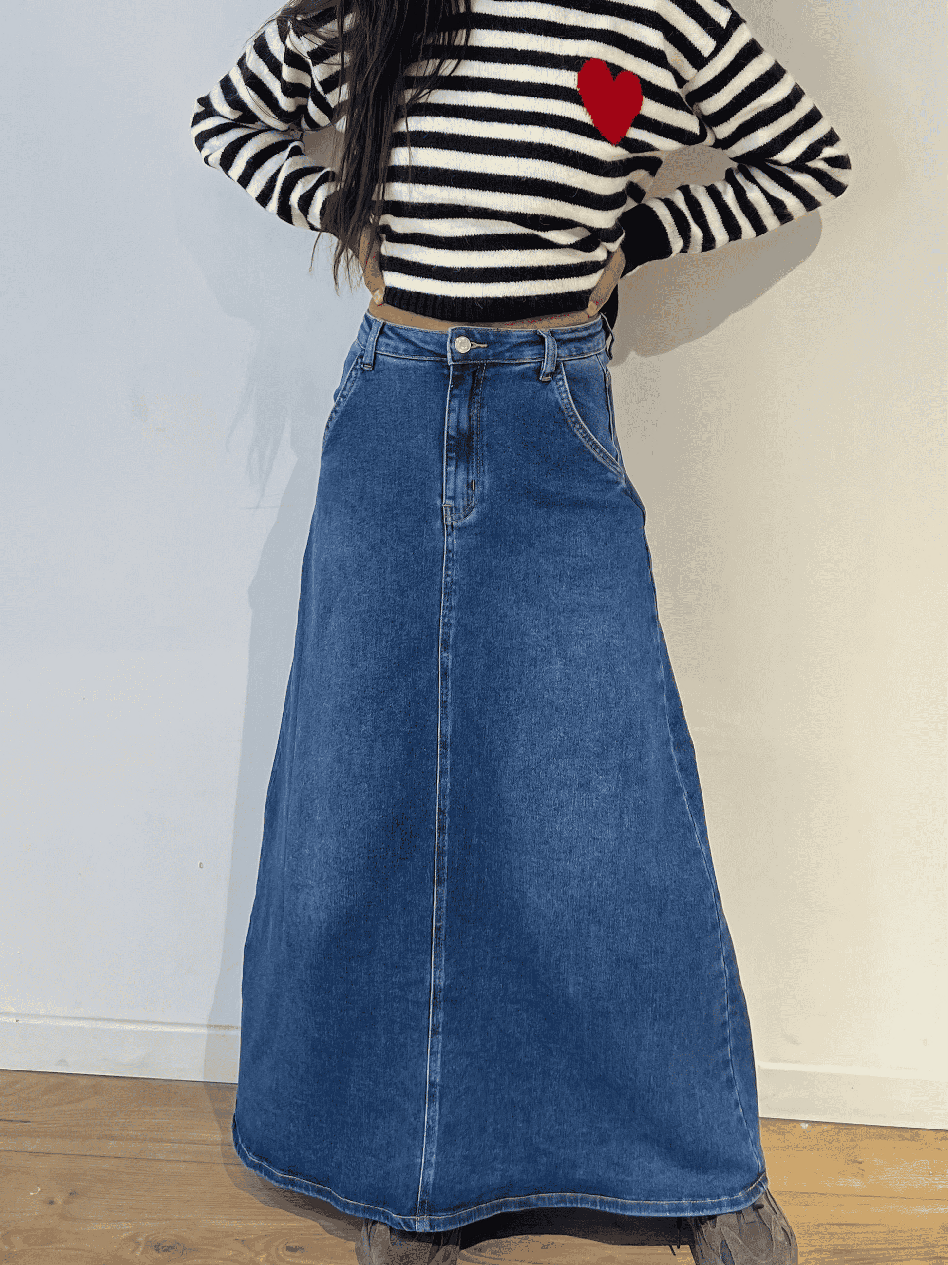 Portez cette jupe en jean longue avec un t-shirt simple et des sneakers pour un look décontracté. Pour une allure plus élégante, associez-la à une blouse légère et des talons. Ajoutez une ceinture pour marquer la taille et créer une silhouette définie. Idéale pour un style casual chic ou une sortie en journée.