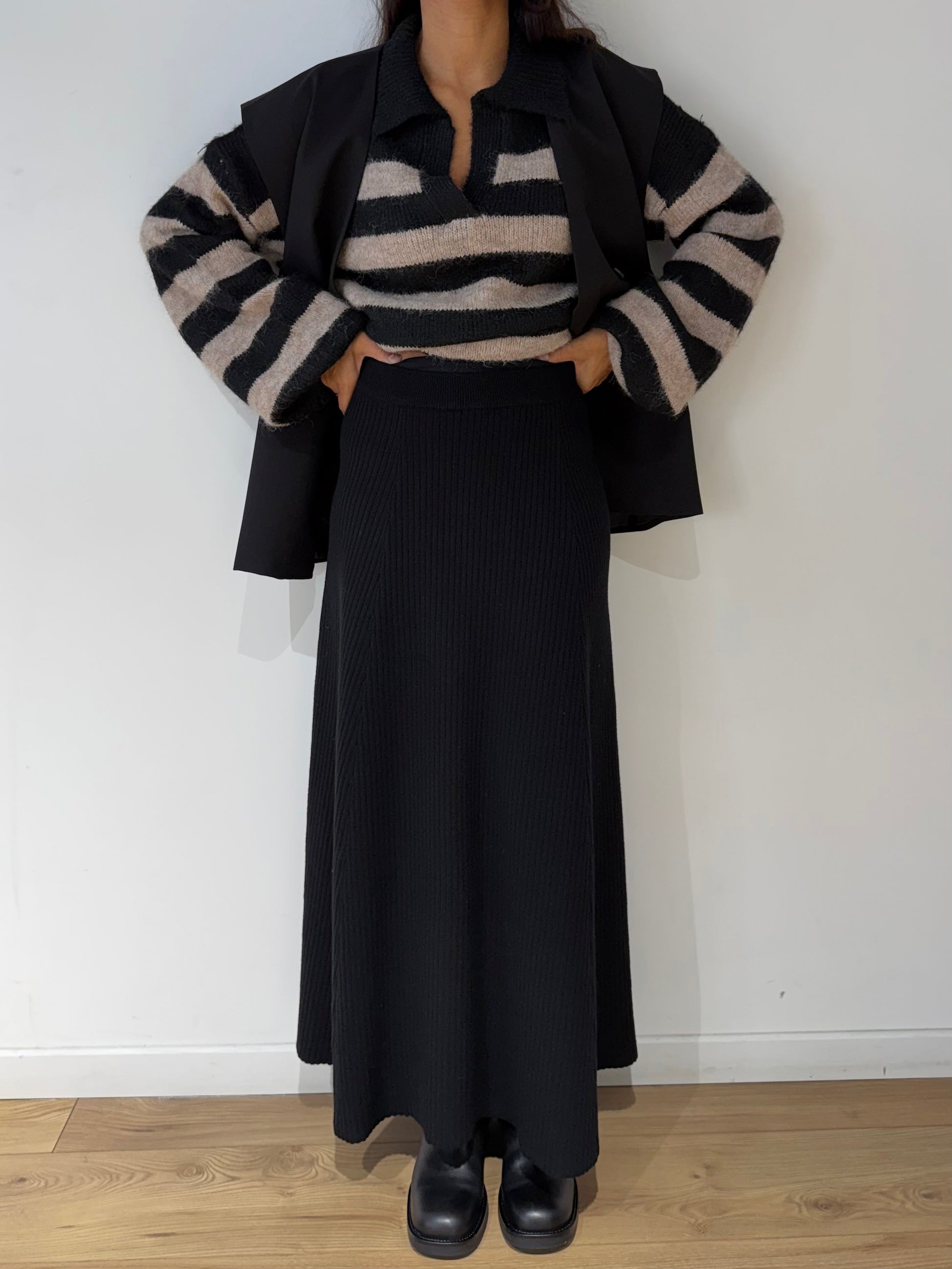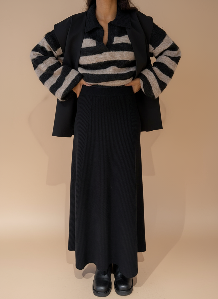 Jupe longue en maille côtelée au tombé fluide et élégant, cette pièce est une alliée idéale pour l’automne-hiver. Taille élastique confortable, coupe évasée légèrement évasée pour une silhouette féminine sans contrainte, elle se porte facilement avec un pull oversize, un gilet long ou une chemise rentrée. Disponible en noir ou marron, elle s’adapte à tous les styles, du plus décontracté au plus raffiné. Une jupe tricotée chaude, pratique et stylée, parfaite pour un look chic et confortable au quotidien.
