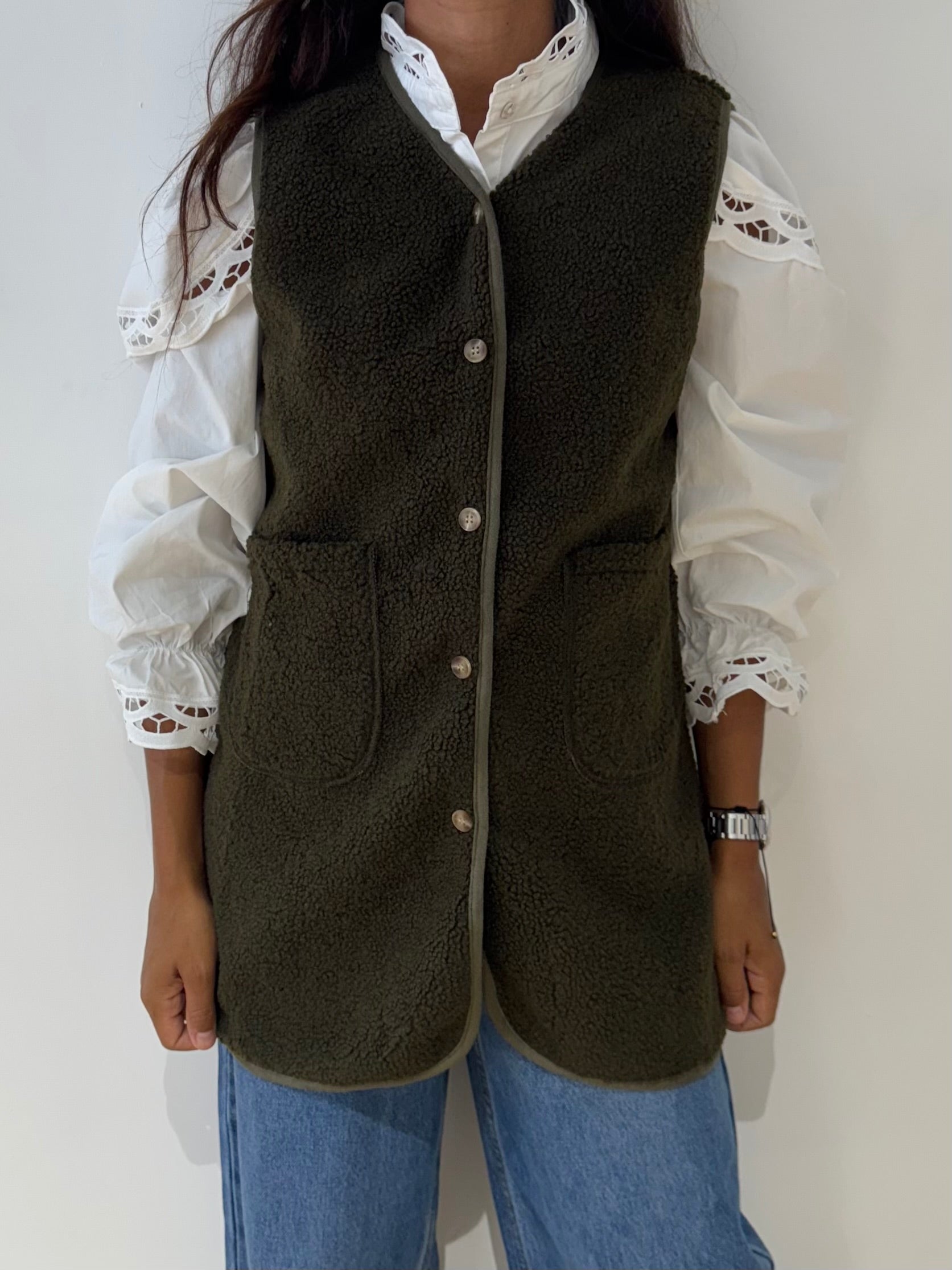 Gilet sans manches effet mouton, doux et confortable, parfait pour apporter chaleur et style à vos tenues d’automne et d’hiver. Sa coupe droite et ses poches plaquées sur le devant en font une pièce à la fois pratique et tendance, facile à superposer sur un pull, une chemise ou même une robe. Fermé par de jolis boutons, il apporte une touche cosy et moderne tout en restant polyvalent et agréable à porter au quotidien. Ce gilet d’inspiration cocooning est disponible en trois couleurs incontournables – marron, beige et kaki – pour s’adapter à toutes vos envies et compléter votre dressing avec élégance et praticité.
